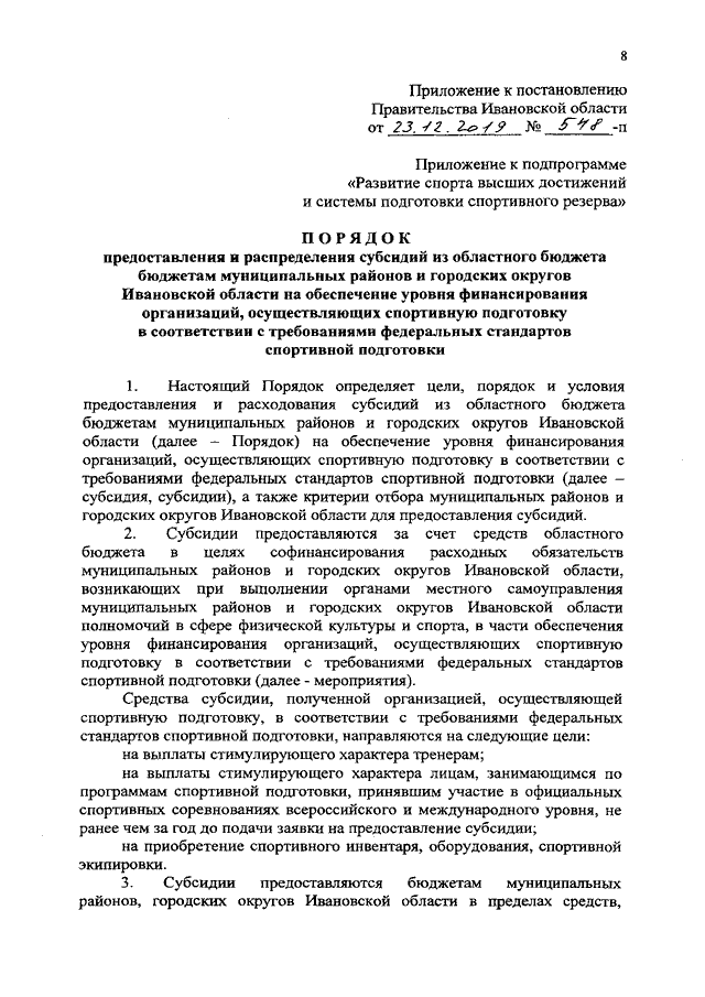 Постановление Правительства Ивановской области от 23.12.2019 N 548-п "О внесении изменений в постановление Правительства Ивановской области от 18.02.2016 N 43-п "Об утверждении государственной программы Ивановской области "Развитие физической культуры и спорта в Ивановской области" (вместе с "Порядком предоставления и распределения субсидий из областного бюджета бюджетам муниципальных районов и городских округов Ивановской области на обеспечение уровня финансирования организаций, осуществляющих спортивную подготовку в соответствии с требованиями федеральных стандартов спортивной подготовки")