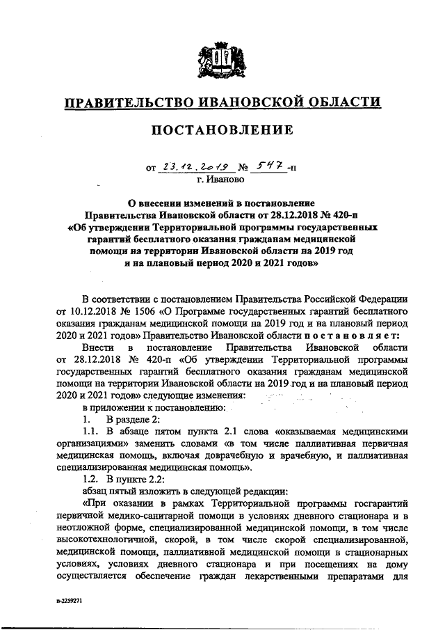 Постановление Правительства Ивановской области от 23.12.2019 N 547-п "О внесении изменений в постановление Правительства Ивановской области от 28.12.2018 N 420-п "Об утверждении Территориальной программы государственных гарантий бесплатного оказания гражданам медицинской помощи на территории Ивановской области на 2019 год и на плановый период 2020 и 2021 годов" (вместе с "Перечнем медицинских организаций, участвующих в предоставлении паллиативной медицинской помощи", "Перечнем медицинских организаций, проводящих профилактические медицинские осмотры, в том числе в рамках диспансеризации")