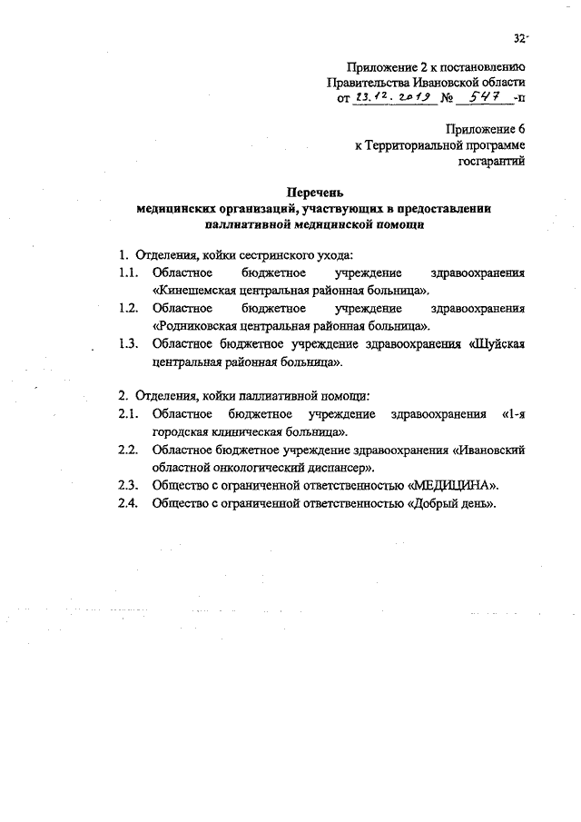 Постановление Правительства Ивановской области от 23.12.2019 N 547-п "О внесении изменений в постановление Правительства Ивановской области от 28.12.2018 N 420-п "Об утверждении Территориальной программы государственных гарантий бесплатного оказания гражданам медицинской помощи на территории Ивановской области на 2019 год и на плановый период 2020 и 2021 годов" (вместе с "Перечнем медицинских организаций, участвующих в предоставлении паллиативной медицинской помощи", "Перечнем медицинских организаций, проводящих профилактические медицинские осмотры, в том числе в рамках диспансеризации")