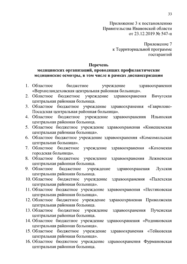 Постановление Правительства Ивановской области от 23.12.2019 N 547-п "О внесении изменений в постановление Правительства Ивановской области от 28.12.2018 N 420-п "Об утверждении Территориальной программы государственных гарантий бесплатного оказания гражданам медицинской помощи на территории Ивановской области на 2019 год и на плановый период 2020 и 2021 годов" (вместе с "Перечнем медицинских организаций, участвующих в предоставлении паллиативной медицинской помощи", "Перечнем медицинских организаций, проводящих профилактические медицинские осмотры, в том числе в рамках диспансеризации")