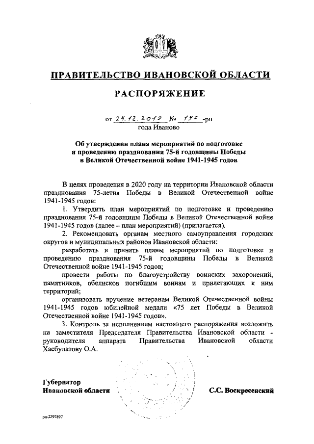 Распоряжение Правительства Ивановской области от 24.12.2019 N 197-рп "Об утверждении плана мероприятий по подготовке и проведению празднования 75-й годовщины Победы в Великой Отечественной войне 1941 - 1945 годов"