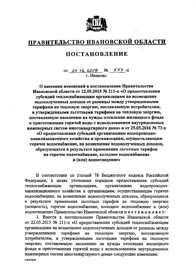 Постановление Правительства Ивановской области от 24.12.2019 N 554-п "О внесении изменений в постановления Правительства Ивановской области от 22.05.2015 N 211-п "О предоставлении субсидий теплоснабжающим организациям на возмещение недополученных доходов от разницы между утвержденными тарифами на тепловую энергию, поставляемую потребителям, и утвержденными льготными тарифами на тепловую энергию, поставляемую населению на нужды отопления жилищного фонда и приготовления горячей воды с использованием внутридомовых инженерных систем многоквартирного дома" и от 25.03.2016 N 73-п "О предоставлении субсидий организациям водопроводно-канализационного хозяйства и организациям, осуществляющим горячее водоснабжение, на возмещение недополученных доходов, образующихся в результате применения льготных тарифов на горячее водоснабжение, холодное водоснабжение и (или) водоотведение"