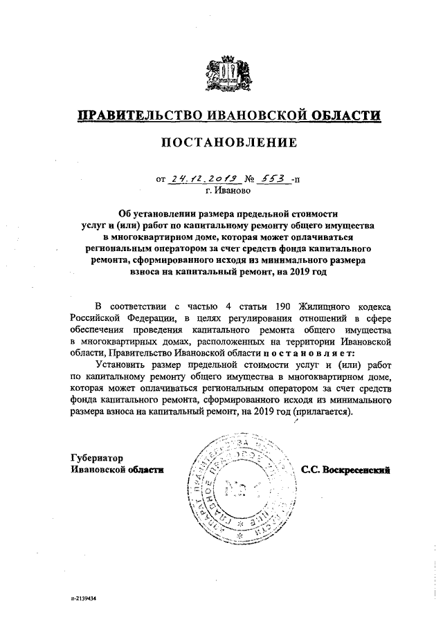 Постановление Правительства Ивановской области от 24.12.2019 N 553-п "Об установлении размера предельной стоимости услуг и (или) работ по капитальному ремонту общего имущества в многоквартирном доме, которая может оплачиваться региональным оператором за счет средств фонда капитального ремонта, сформированного исходя из минимального размера взноса на капитальный ремонт, на 2019 год"