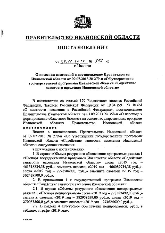 Постановление Правительства Ивановской области от 24.12.2019 N 552-п "О внесении изменений в постановление Правительства Ивановской области от 09.07.2013 N 279-п "Об утверждении государственной программы Ивановской области "Содействие занятости населения Ивановской области"