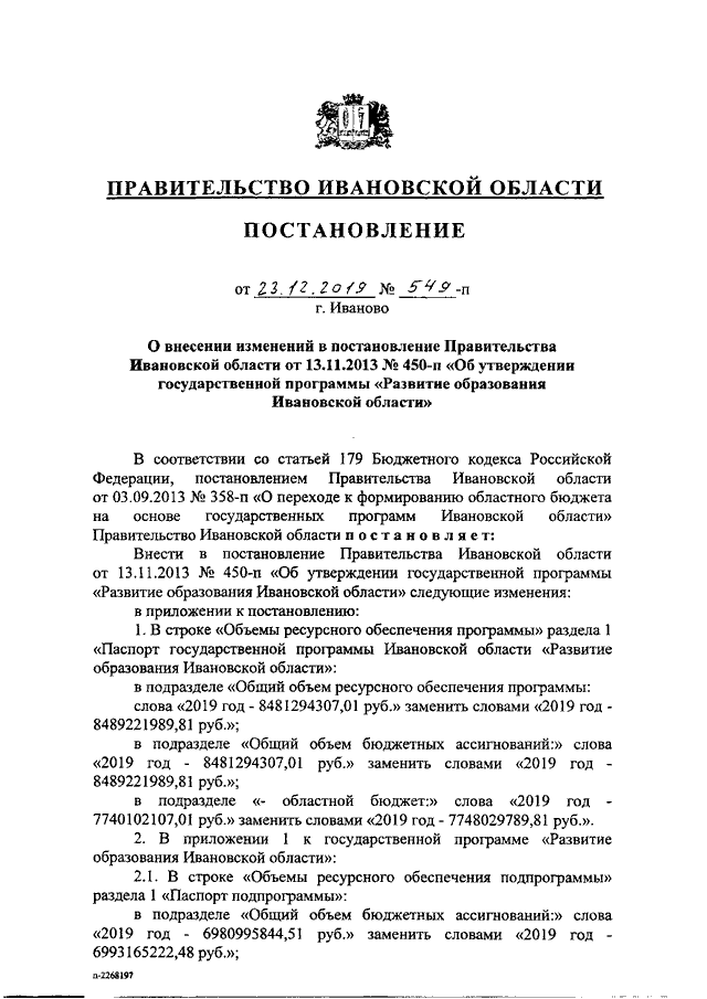 Постановление Правительства Ивановской области от 23.12.2019 N 549-п "О внесении изменений в постановление Правительства Ивановской области от 13.11.2013 N 450-п "Об утверждении государственной программы "Развитие образования Ивановской области"