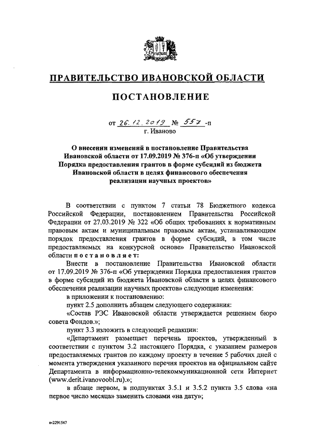 Постановление Правительства Ивановской области от 26.12.2019 N 557-п "О внесении изменений в постановление Правительства Ивановской области от 17.09.2019 N 376-п "Об утверждении Порядка предоставления грантов в форме субсидий из бюджета Ивановской области в целях финансового обеспечения реализации научных проектов"