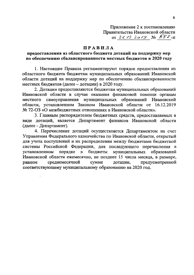 Постановление Правительства Ивановской области от 26.12.2019 N 558-п "О дотациях на поддержку мер по обеспечению сбалансированности местных бюджетов в 2020 году" (вместе с "Методикой распределения из областного бюджета дотаций на поддержку мер по обеспечению сбалансированности местных бюджетов в 2020 году", "Правилами предоставления из областного бюджета дотаций на поддержку мер по обеспечению сбалансированности местных бюджетов в 2020 году")
