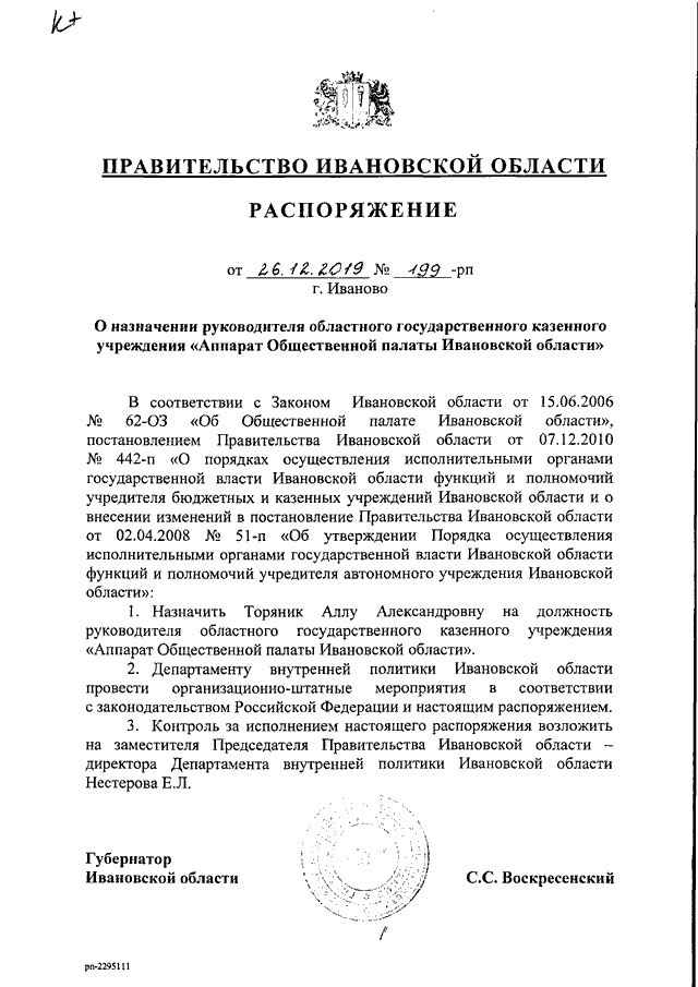 Распоряжение Правительства Ивановской области от 26.12.2019 N 199-рп "О назначении руководителя областного государственного казенного учреждения "Аппарат Общественной палаты Ивановской области"