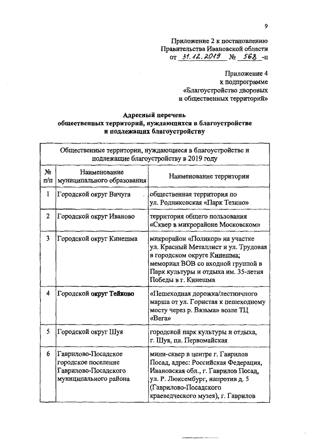 Постановление Правительства Ивановской области от 31.12.2019 N 568-п "О внесении изменений в постановление Правительства Ивановской области от 01.09.2017 N 337-п "Об утверждении государственной программы Ивановской области "Формирование современной городской среды" и об утверждении Порядка определения объема и предоставления субсидии автономной некоммерческой организации "Центр территориального развития Ивановской области" в виде имущественного взноса Ивановской области на обеспечение деятельности" (вместе с "Адресным перечнем общественных территорий, нуждающихся в благоустройстве и подлежащих благоустройству")