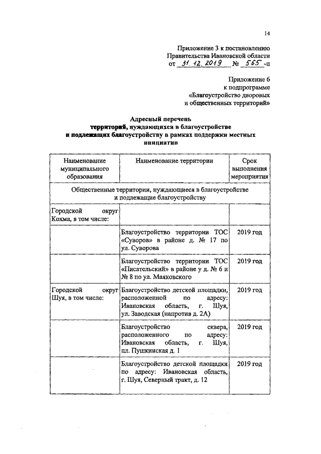 Постановление Правительства Ивановской области от 31.12.2019 N 565-п "О внесении изменений в постановление Правительства Ивановской области от 01.09.2017 N 337-п "Об утверждении государственной программы Ивановской области "Формирование современной городской среды" (вместе с "Адресным перечнем территорий, нуждающихся в благоустройстве и подлежащих благоустройству в рамках поддержки местных инициатив")