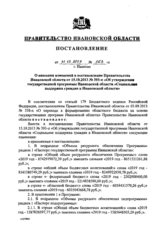 Постановление Правительства Ивановской области от 31.12.2019 N 563-п "О внесении изменений в постановление Правительства Ивановской области от 15.10.2013 N 393-п "Об утверждении государственной программы Ивановской области "Социальная поддержка граждан в Ивановской области"