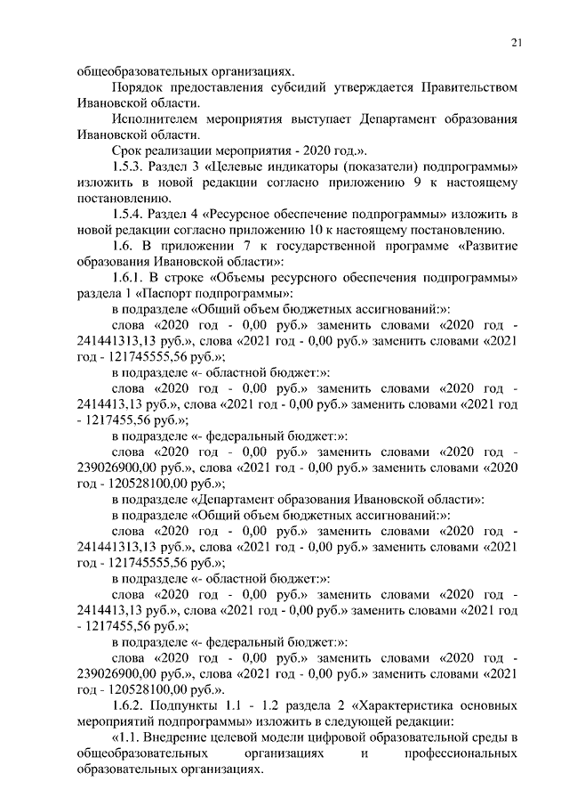 Постановление Правительства Ивановской области от 31.12.2019 N 561-п "О внесении изменений в постановление Правительства Ивановской области от 13.11.2013 N 450-п "Об утверждении государственной программы "Развитие образования Ивановской области" (вместе с "Порядком формирования, предоставления и распределения субсидий бюджетам муниципальных образований Ивановской области на благоустройство зданий государственных и муниципальных общеобразовательных организаций в целях соблюдения требований к воздушно-тепловому режиму, водоснабжению и канализации", "Порядком формирования, предоставления и распределения субсидий бюджетам муниципальных районов и городских округов Ивановской области на создание (обновление) материально-технической базы для реализации основных и дополнительных общеобразовательных программ цифрового и гуманитарного профилей в общеобразовательных организациях, расположенных в сельской местности и малых городах", "Порядком формирования, предоставления и распределения субсидий бюджетам муниципальных районов и городских округов Ивановской области на внедрение целевой модели цифровой образовательной среды в общеобразовательных организациях и профессиональных образовательных организациях", "Порядком формирования, предоставления и распределения субсидий бюджетам муниципальных районов и городских округов Ивановской области на создание и функционирование в Ивановской области центров цифрового образования детей")