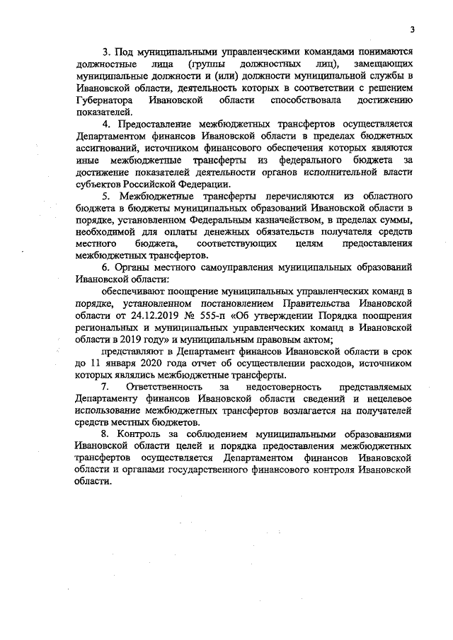 Постановление Правительства Ивановской области от 24.12.2019 N 556-п "Об утверждении Порядка предоставления в 2019 году из областного бюджета бюджетам муниципальных образований Ивановской области иных межбюджетных трансфертов на цели поощрения муниципальных управленческих команд"