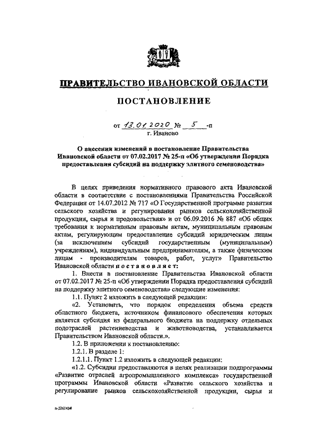 Постановление Правительства Ивановской области от 13.01.2020 N 5-п "О внесении изменений в постановление Правительства Ивановской области от 07.02.2017 N 25-п "Об утверждении Порядка предоставления субсидий на поддержку элитного семеноводства"
