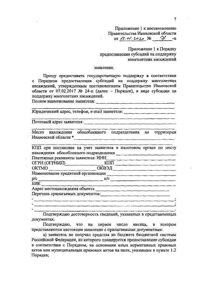 Постановление Правительства Ивановской области от 13.01.2020 N 7-п "О внесении изменений в постановление Правительства Ивановской области от 07.02.2017 N 24-п "Об утверждении Порядка предоставления субсидий на поддержку многолетних насаждений"