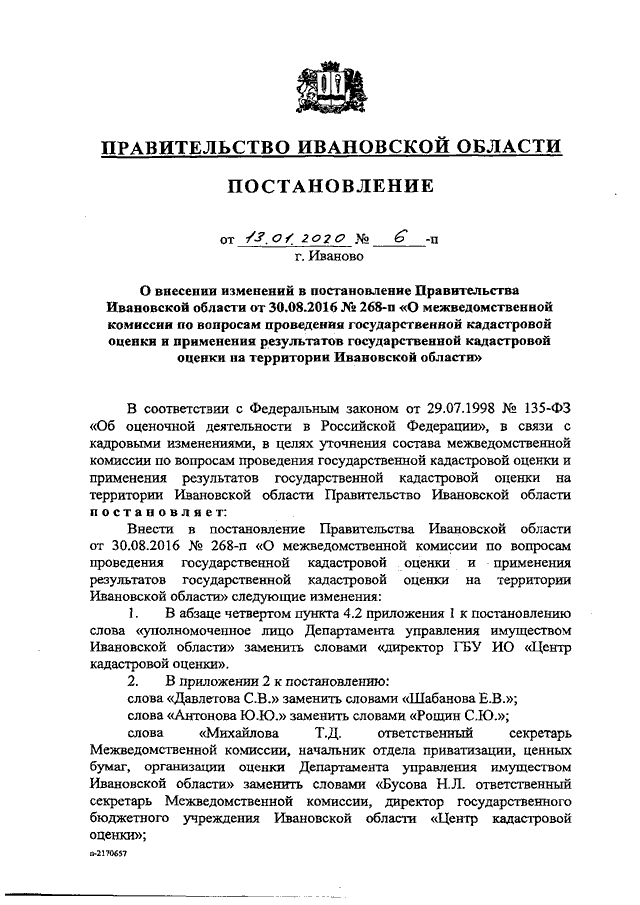 Постановление Правительства Ивановской области от 13.01.2020 N 6-п "О внесении изменений в постановление Правительства Ивановской области от 30.08.2016 N 268-п "О межведомственной комиссии по вопросам проведения государственной кадастровой оценки и применения результатов государственной кадастровой оценки на территории Ивановской области"
