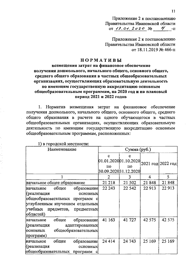 Постановление Правительства Ивановской области от 13.01.2020 N 4-п "О внесении изменений в постановление Правительства Ивановской области от 18.11.2019 N 466-п "Об утверждении нормативов обеспечения государственных гарантий реализации прав на получение общедоступного и бесплатного общего образования, обеспечения дополнительного образования в муниципальных образовательных организациях и возмещения затрат на финансовое обеспечение получения общего образования в частных образовательных организациях на 2020 год и на плановый период 2021 и 2022 годов" (вместе с "Нормативами обеспечения государственных гарантий реализации прав на получение общедоступного и бесплатного дошкольного, начального общего, основного общего, среднего общего образования в муниципальных общеобразовательных организациях, обеспечения дополнительного образования в муниципальных общеобразовательных организациях на 2020 год и на плановый период 2021 и 2022 годов", "Нормативами возмещения затрат на финансовое обеспечение получения дошкольного, начального общего, основного общего, среднего общего образования в частных общеобразовательных организациях, осуществляющих образовательную деятельность по имеющим государственную аккредитацию основным общеобразовательным программам, на 2020 год и на плановый период 2021 и 2022 годов", "Нормативами обеспечения государственных гарантий реализации прав на получение общедоступного и бесплатного дошкольного образования в муниципальных дошкольных образовательных организациях на 2020 год и на плановый период 2021 и 2022 годов", "Нормативами возмещения затрат на финансовое обеспечение получения дошкольного образования в частных дошкольных образовательных организациях на 2020 год и на плановый период 2021 и 2022 годов")