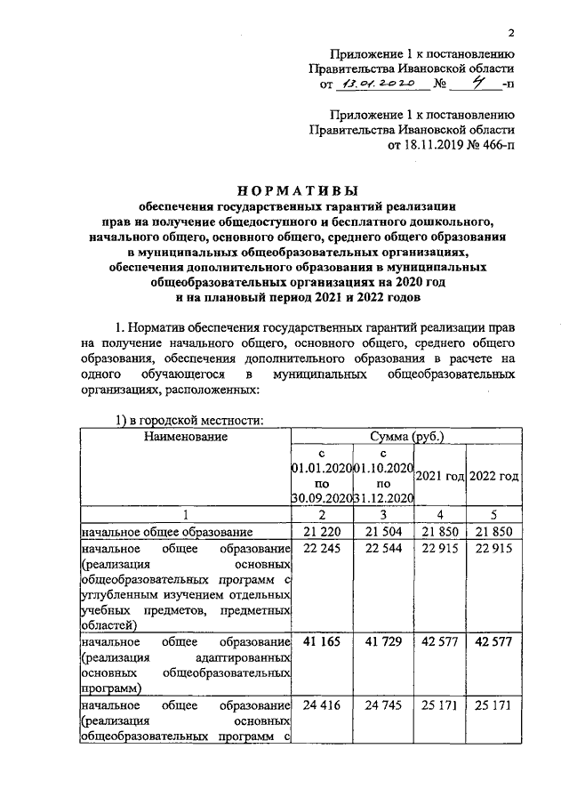 Постановление Правительства Ивановской области от 13.01.2020 N 4-п "О внесении изменений в постановление Правительства Ивановской области от 18.11.2019 N 466-п "Об утверждении нормативов обеспечения государственных гарантий реализации прав на получение общедоступного и бесплатного общего образования, обеспечения дополнительного образования в муниципальных образовательных организациях и возмещения затрат на финансовое обеспечение получения общего образования в частных образовательных организациях на 2020 год и на плановый период 2021 и 2022 годов" (вместе с "Нормативами обеспечения государственных гарантий реализации прав на получение общедоступного и бесплатного дошкольного, начального общего, основного общего, среднего общего образования в муниципальных общеобразовательных организациях, обеспечения дополнительного образования в муниципальных общеобразовательных организациях на 2020 год и на плановый период 2021 и 2022 годов", "Нормативами возмещения затрат на финансовое обеспечение получения дошкольного, начального общего, основного общего, среднего общего образования в частных общеобразовательных организациях, осуществляющих образовательную деятельность по имеющим государственную аккредитацию основным общеобразовательным программам, на 2020 год и на плановый период 2021 и 2022 годов", "Нормативами обеспечения государственных гарантий реализации прав на получение общедоступного и бесплатного дошкольного образования в муниципальных дошкольных образовательных организациях на 2020 год и на плановый период 2021 и 2022 годов", "Нормативами возмещения затрат на финансовое обеспечение получения дошкольного образования в частных дошкольных образовательных организациях на 2020 год и на плановый период 2021 и 2022 годов")