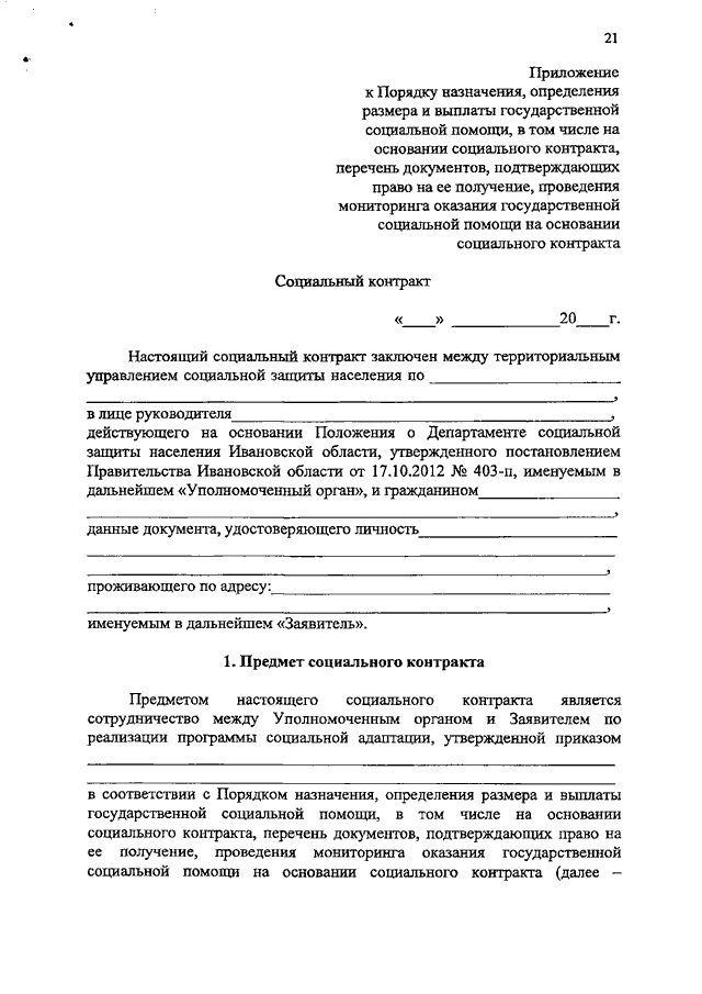 Постановление Правительства Ивановской области от 22.01.2020 N 12-п "Об оказании государственной социальной помощи, в том числе на основании социального контракта" (вместе с "Порядком назначения, определения размера и выплаты государственной социальной помощи, в том числе на основании социального контракта, перечня документов, подтверждающих право на ее получение, проведения мониторинга оказания государственной социальной помощи на основании социального контракта")