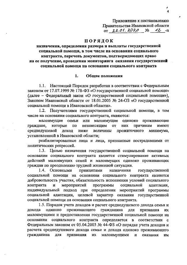 Постановление Правительства Ивановской области от 22.01.2020 N 12-п "Об оказании государственной социальной помощи, в том числе на основании социального контракта" (вместе с "Порядком назначения, определения размера и выплаты государственной социальной помощи, в том числе на основании социального контракта, перечня документов, подтверждающих право на ее получение, проведения мониторинга оказания государственной социальной помощи на основании социального контракта")
