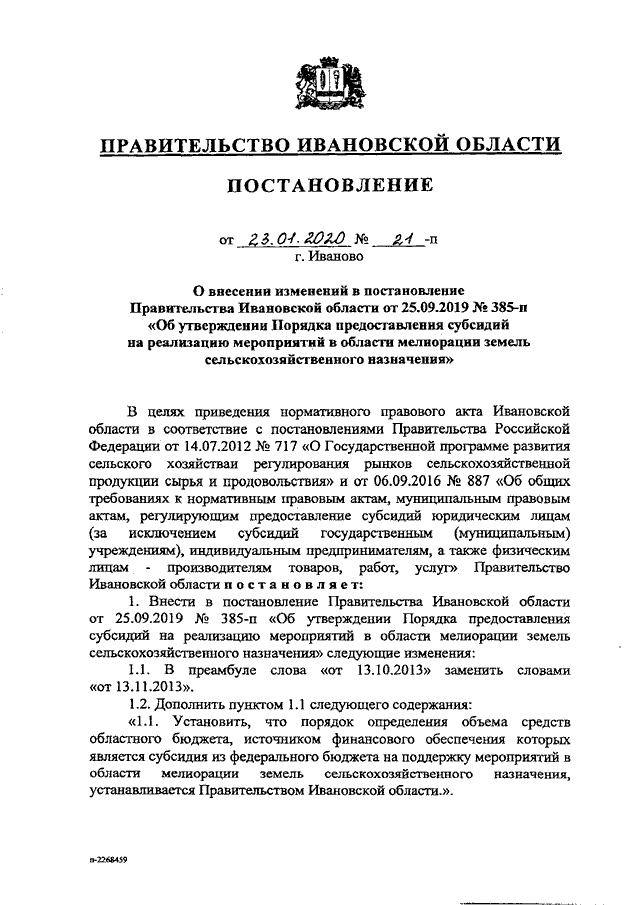 Постановление Правительства Ивановской области от 23.01.2020 N 21-п "О внесении изменений в постановление Правительства Ивановской области от 25.09.2019 N 385-п "Об утверждении Порядка предоставления субсидий на реализацию мероприятий в области мелиорации земель сельскохозяйственного назначения"