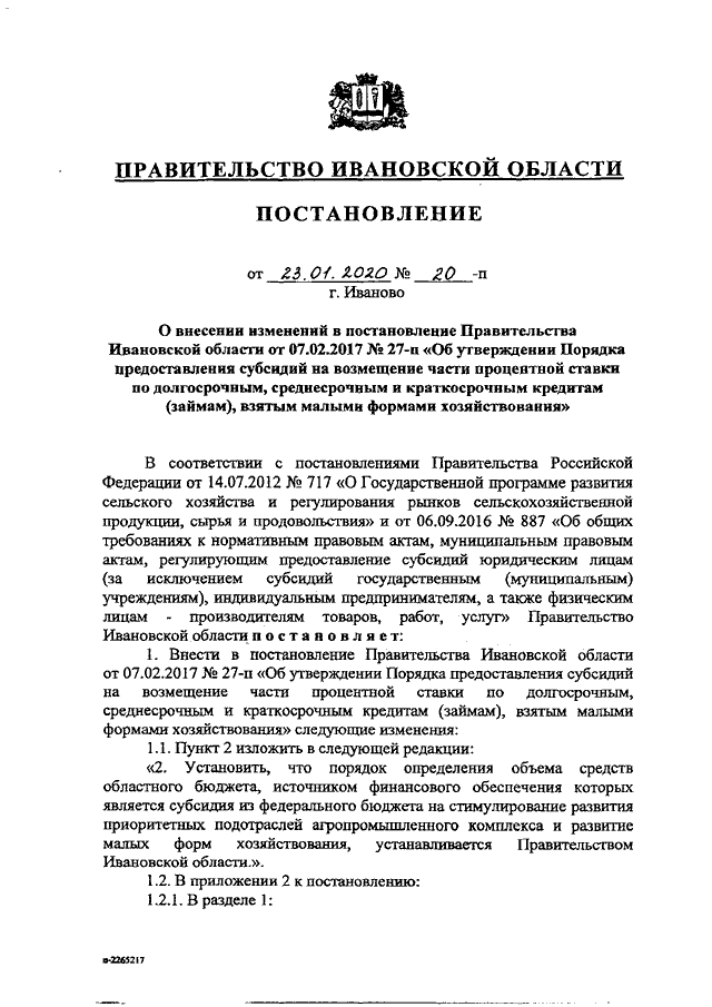 Постановление Правительства Ивановской области от 23.01.2020 N 20-п "О внесении изменений в постановление Правительства Ивановской области от 07.02.2017 N 27-п "Об утверждении Порядка предоставления субсидий на возмещение части процентной ставки по долгосрочным, среднесрочным и краткосрочным кредитам (займам), взятым малыми формами хозяйствования"