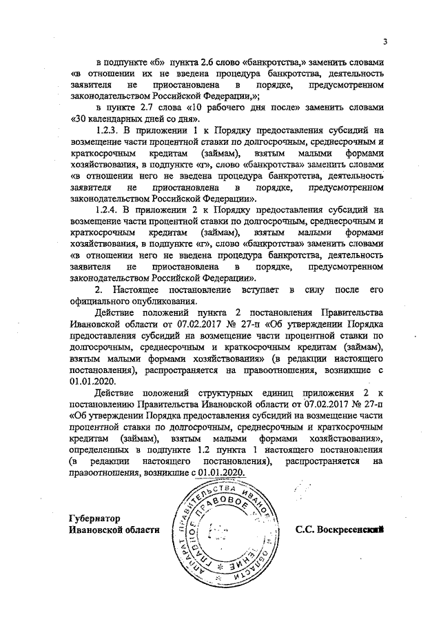 Постановление Правительства Ивановской области от 23.01.2020 N 20-п "О внесении изменений в постановление Правительства Ивановской области от 07.02.2017 N 27-п "Об утверждении Порядка предоставления субсидий на возмещение части процентной ставки по долгосрочным, среднесрочным и краткосрочным кредитам (займам), взятым малыми формами хозяйствования"