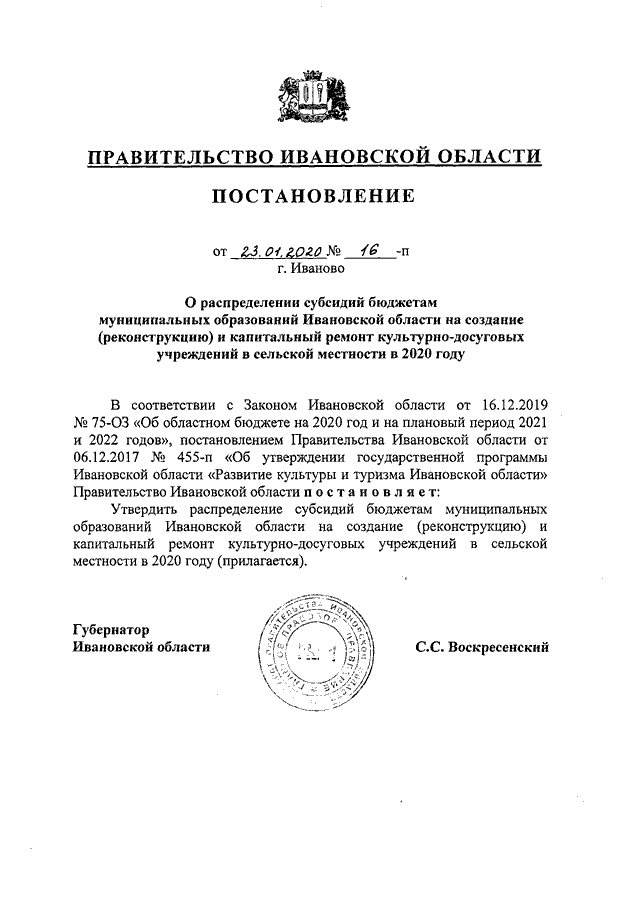 Постановление Правительства Ивановской области от 23.01.2020 N 16-п "О распределении субсидий бюджетам муниципальных образований Ивановской области на создание (реконструкцию) и капитальный ремонт культурно-досуговых учреждений в сельской местности в 2020 году"