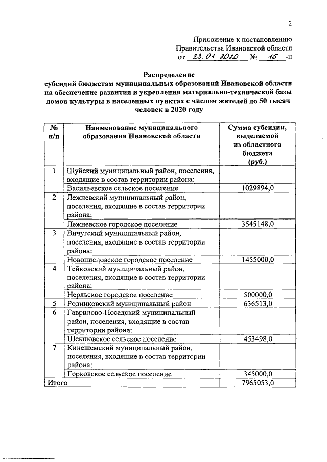 Постановление Правительства Ивановской области от 23.01.2020 N 15-п "О распределении субсидий бюджетам муниципальных образований Ивановской области на обеспечение развития и укрепления материально-технической базы домов культуры в населенных пунктах с числом жителей до 50 тысяч человек в 2020 году"