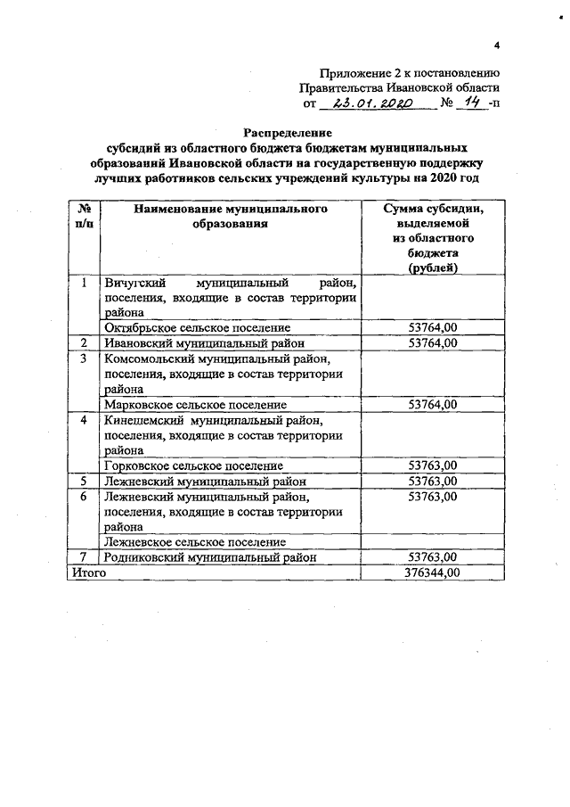 Постановление Правительства Ивановской области от 23.01.2020 N 14-п "О распределении субсидий из областного бюджета бюджетам муниципальных образований Ивановской области на государственную поддержку лучших сельских учреждений культуры, государственную поддержку лучших работников сельских учреждений культуры, на подключение муниципальных общедоступных библиотек к информационно-телекоммуникационной сети Интернет и развитие библиотечного дела с учетом задачи расширения информационных технологий и оцифровки на 2020 год"