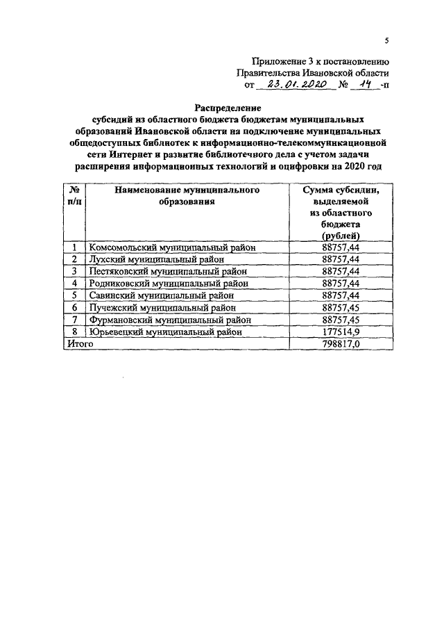 Постановление Правительства Ивановской области от 23.01.2020 N 14-п "О распределении субсидий из областного бюджета бюджетам муниципальных образований Ивановской области на государственную поддержку лучших сельских учреждений культуры, государственную поддержку лучших работников сельских учреждений культуры, на подключение муниципальных общедоступных библиотек к информационно-телекоммуникационной сети Интернет и развитие библиотечного дела с учетом задачи расширения информационных технологий и оцифровки на 2020 год"