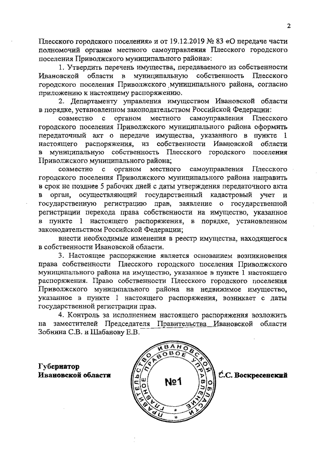 Распоряжение Правительства Ивановской области от 23.01.2020 N 2-рп "О передаче имущества из собственности Ивановской области в муниципальную собственность Плесского городского поселения Приволжского муниципального района"