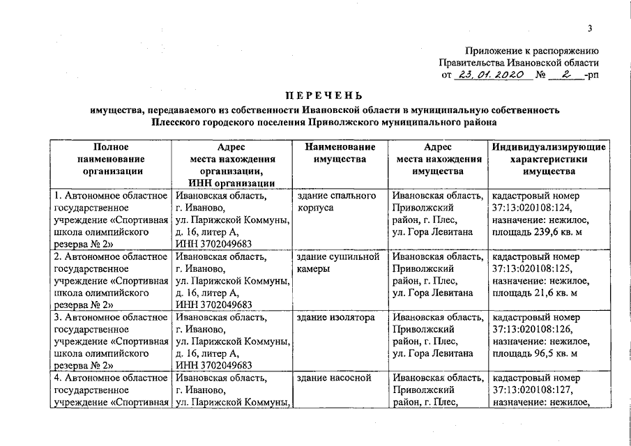 Распоряжение Правительства Ивановской области от 23.01.2020 N 2-рп "О передаче имущества из собственности Ивановской области в муниципальную собственность Плесского городского поселения Приволжского муниципального района"