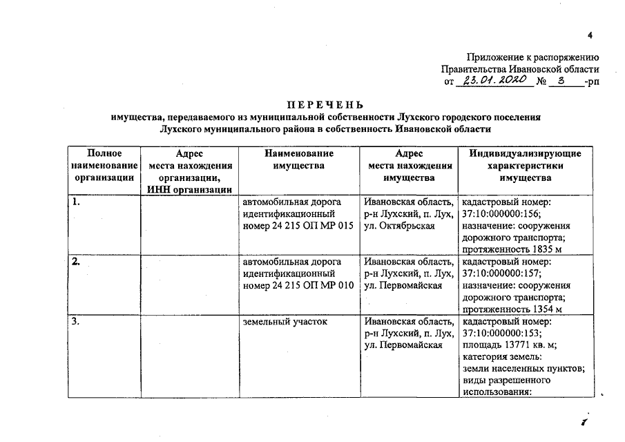 Распоряжение Правительства Ивановской области от 23.01.2020 N 3-рп "О передаче из муниципальной собственности Лухского городского поселения Лухского муниципального района в собственность Ивановской области автомобильных дорог и о внесении изменений в распоряжение Правительства Ивановской области от 02.07.2008 N 222-рп "Об утверждении перечня автомобильных дорог общего пользования регионального или межмуниципального значения Ивановской области" (вместе с "Перечнем имущества, передаваемого из муниципальной собственности Лухского городского поселения Лухского муниципального района в собственность Ивановской области")