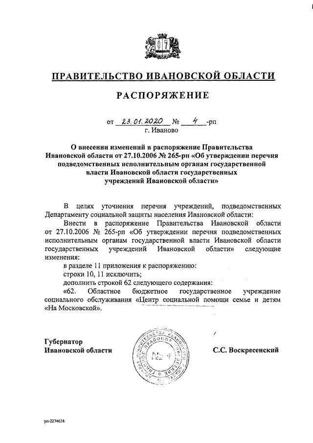 Распоряжение Правительства Ивановской области от 23.01.2020 N 4-рп "О внесении изменений в распоряжение Правительства Ивановской области от 27.10.2006 N 265-рп "Об утверждении перечня подведомственных исполнительным органам государственной власти Ивановской области государственных учреждений Ивановской области"