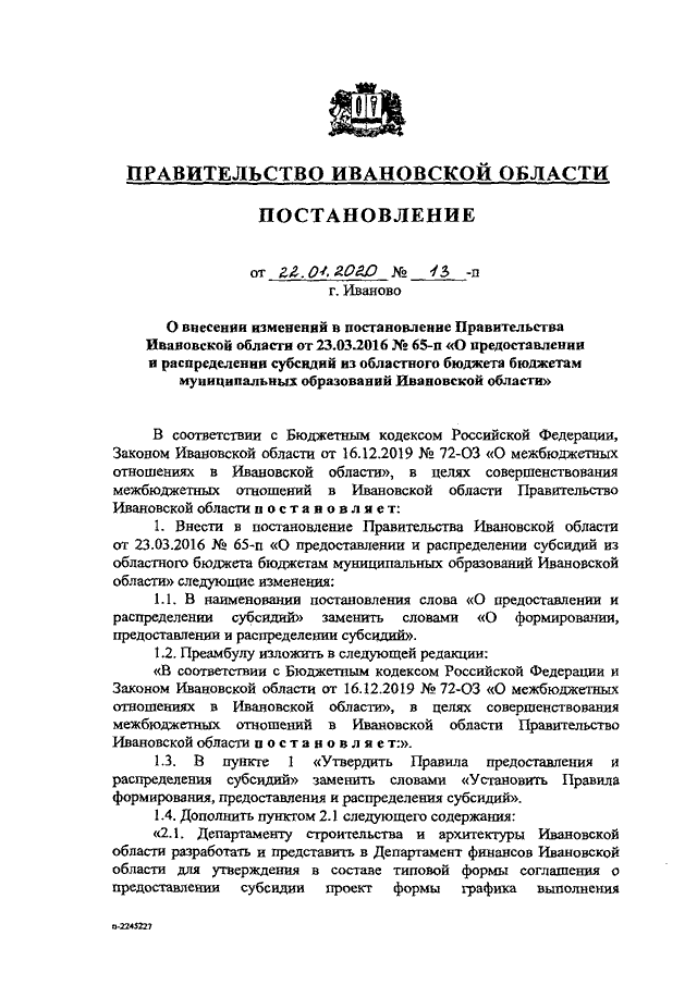 Постановление Правительства Ивановской области от 22.01.2020 N 13-п "О внесении изменений в постановление Правительства Ивановской области от 23.03.2016 N 65-п "О предоставлении и распределении субсидий из областного бюджета бюджетам муниципальных образований Ивановской области"