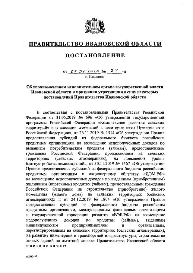 Постановление Правительства Ивановской области от 27.01.2020 N 27-п "Об уполномоченном исполнительном органе государственной власти Ивановской области и признании утратившими силу некоторых постановлений Правительства Ивановской области"