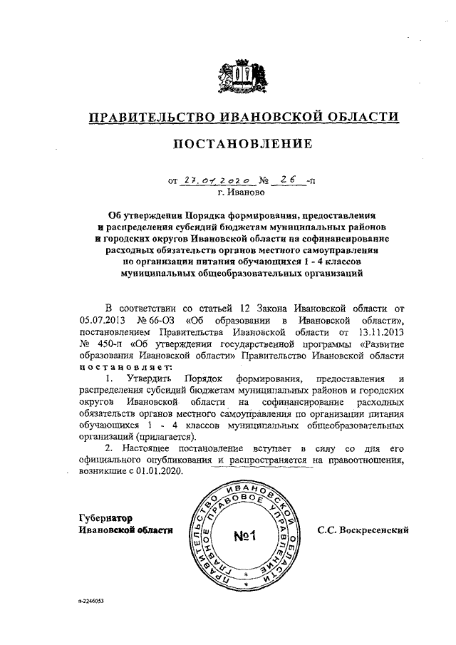 Постановление Правительства Ивановской области от 27.01.2020 N 26-п "Об утверждении Порядка формирования, предоставления и распределения субсидий бюджетам муниципальных районов и городских округов Ивановской области на софинансирование расходных обязательств органов местного самоуправления по организации питания обучающихся 1 - 4 классов муниципальных общеобразовательных организаций"
