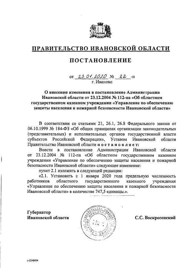 Постановление Правительства Ивановской области от 23.01.2020 N 22-п "О внесении изменения в постановление Администрации Ивановской области от 23.12.2004 N 112-па "Об областном государственном казенном учреждении "Управление по обеспечению защиты населения и пожарной безопасности Ивановской области"