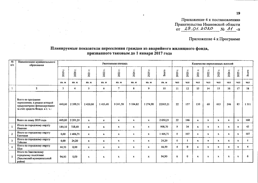 Постановление Правительства Ивановской области от 29.01.2020 N 31-п "О внесении изменений в постановление Правительства Ивановской области от 09.04.2019 N 131-п "Об утверждении региональной адресной программы "Переселение граждан из аварийного жилищного фонда на территории Ивановской области на 2019 - 2025 годы" (вместе с "Перечнем многоквартирных домов, признанных аварийными до 1 января 2017 года", "Планом реализации мероприятий по переселению граждан из аварийного жилищного фонда, признанного таковым до 1 января 2017 года, по способам переселения", "Планом мероприятий по переселению граждан из аварийного жилищного фонда, признанного таковым до 1 января 2017 года")