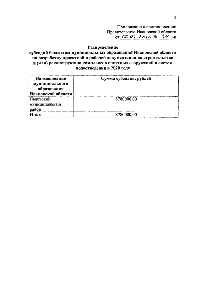 Постановление Правительства Ивановской области от 03.02.2020 N 34-п "О распределении субсидий бюджетам муниципальных образований Ивановской области на разработку проектной и рабочей документации на строительство и (или) реконструкцию комплексов очистных сооружений и систем водоотведения в 2020 году"