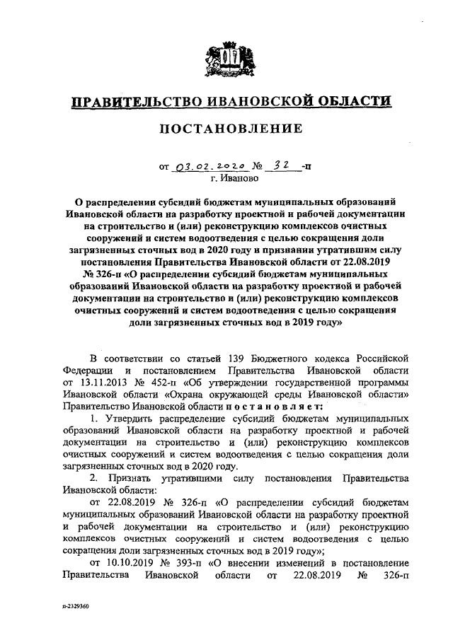 Постановление Правительства Ивановской области от 03.02.2020 N 32-п "О распределении субсидий бюджетам муниципальных образований Ивановской области на разработку проектной и рабочей документации на строительство и (или) реконструкцию комплексов очистных сооружений и систем водоотведения с целью сокращения доли загрязненных сточных вод в 2020 году и признании утратившим силу постановления Правительства Ивановской области от 22.08.2019 N 326-п "О распределении субсидий бюджетам муниципальных образований Ивановской области на разработку проектной и рабочей документации на строительство и (или) реконструкцию комплексов очистных сооружений и систем водоотведения с целью сокращения доли загрязненных сточных вод в 2019 году"