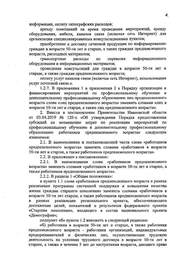 Постановление Правительства Ивановской области от 10.02.2020 N 35-п "О внесении изменений в постановления Правительства Ивановской области от 03.04.2019 N 115-п "Об утверждении Порядка организации и финансирования мероприятий по профессиональному обучению и дополнительному профессиональному образованию лиц предпенсионного возраста", от 03.04.2019 N 120-п "Об утверждении Порядка предоставления субсидий на возмещение затрат по реализации мероприятий по профессиональному обучению и дополнительному профессиональному образованию работников предпенсионного возраста"