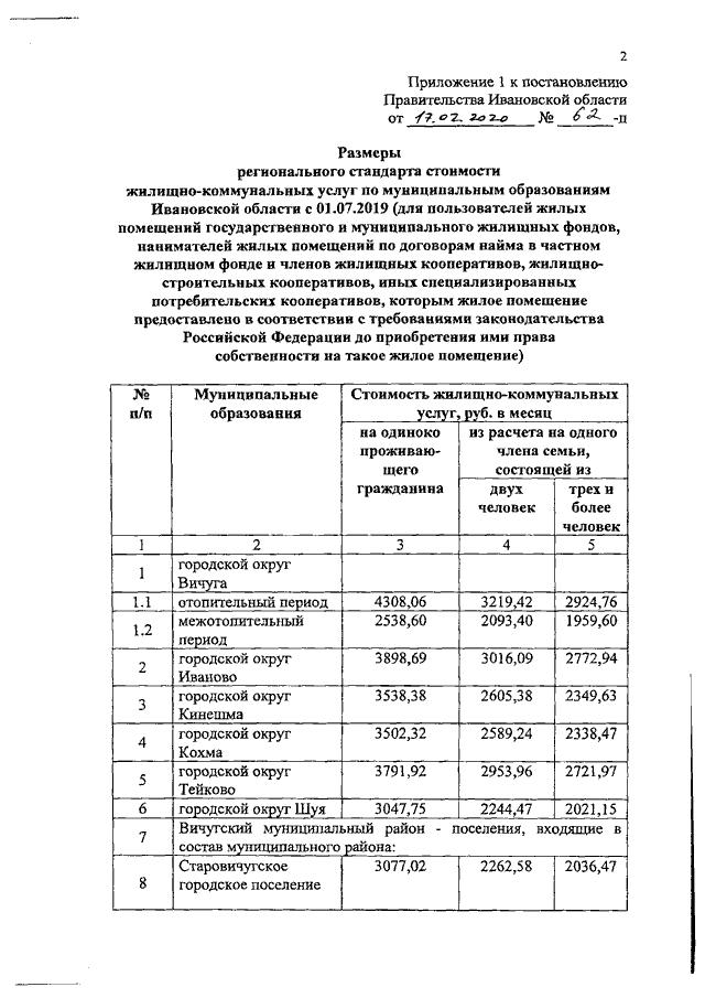 Постановление Правительства Ивановской области от 17.02.2020 N 62-п "Об установлении размеров региональных стандартов стоимости жилищно-коммунальных услуг"
