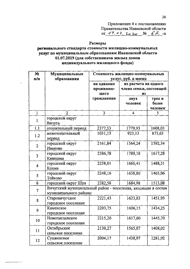 Постановление Правительства Ивановской области от 17.02.2020 N 62-п "Об установлении размеров региональных стандартов стоимости жилищно-коммунальных услуг"