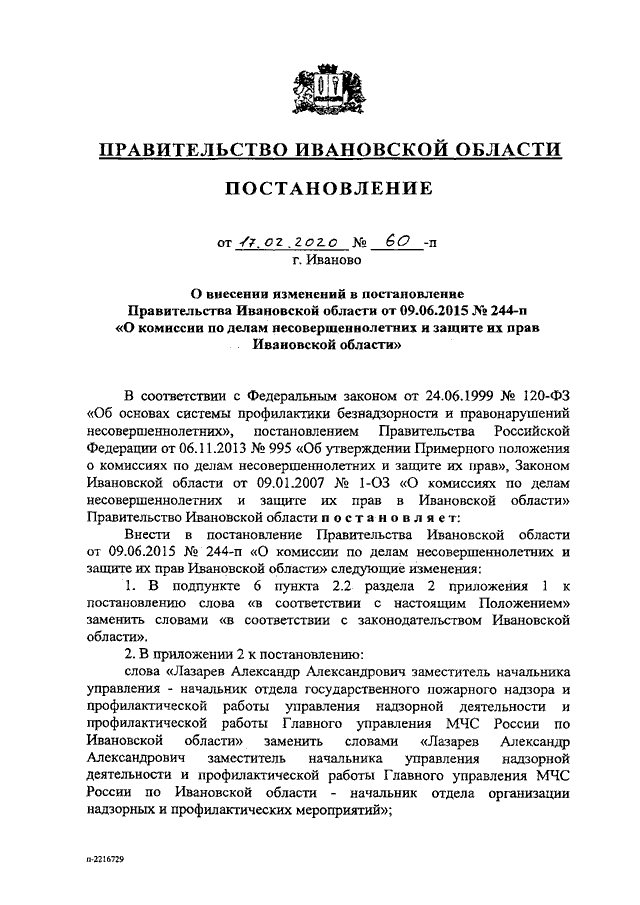 Постановление Правительства Ивановской области от 17.02.2020 N 60-п "О внесении изменений в постановление Правительства Ивановской области от 09.06.2015 N 244-п "О комиссии по делам несовершеннолетних и защите их прав Ивановской области"