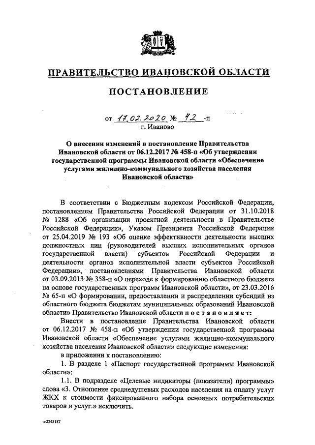 Постановление Правительства Ивановской области от 17.02.2020 N 42-п "О внесении изменений в постановление Правительства Ивановской области от 06.12.2017 N 458-п "Об утверждении государственной программы Ивановской области "Обеспечение услугами жилищно-коммунального хозяйства населения Ивановской области" (вместе с "Порядком предоставления и распределения субсидий бюджетам муниципальных образований Ивановской области на строительство и реконструкцию (модернизацию) объектов питьевого водоснабжения", "Порядком предоставления и распределения субсидий бюджетам муниципальных образований Ивановской области на разработку проектной и рабочей документации на строительство и реконструкцию (модернизацию) объектов питьевого водоснабжения", "Прогнозом тарифных последствий реализации мероприятий региональной программы по повышению качества водоснабжения")