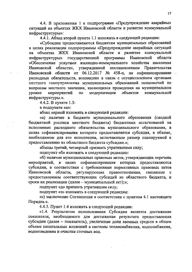 Постановление Правительства Ивановской области от 17.02.2020 N 42-п "О внесении изменений в постановление Правительства Ивановской области от 06.12.2017 N 458-п "Об утверждении государственной программы Ивановской области "Обеспечение услугами жилищно-коммунального хозяйства населения Ивановской области" (вместе с "Порядком предоставления и распределения субсидий бюджетам муниципальных образований Ивановской области на строительство и реконструкцию (модернизацию) объектов питьевого водоснабжения", "Порядком предоставления и распределения субсидий бюджетам муниципальных образований Ивановской области на разработку проектной и рабочей документации на строительство и реконструкцию (модернизацию) объектов питьевого водоснабжения", "Прогнозом тарифных последствий реализации мероприятий региональной программы по повышению качества водоснабжения")