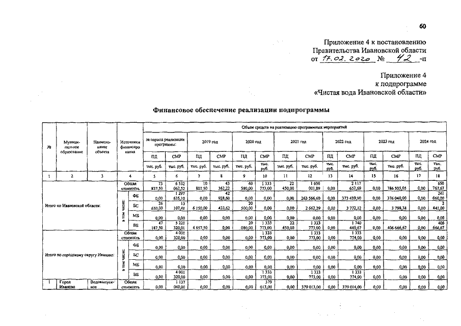 Постановление Правительства Ивановской области от 17.02.2020 N 42-п "О внесении изменений в постановление Правительства Ивановской области от 06.12.2017 N 458-п "Об утверждении государственной программы Ивановской области "Обеспечение услугами жилищно-коммунального хозяйства населения Ивановской области" (вместе с "Порядком предоставления и распределения субсидий бюджетам муниципальных образований Ивановской области на строительство и реконструкцию (модернизацию) объектов питьевого водоснабжения", "Порядком предоставления и распределения субсидий бюджетам муниципальных образований Ивановской области на разработку проектной и рабочей документации на строительство и реконструкцию (модернизацию) объектов питьевого водоснабжения", "Прогнозом тарифных последствий реализации мероприятий региональной программы по повышению качества водоснабжения")
