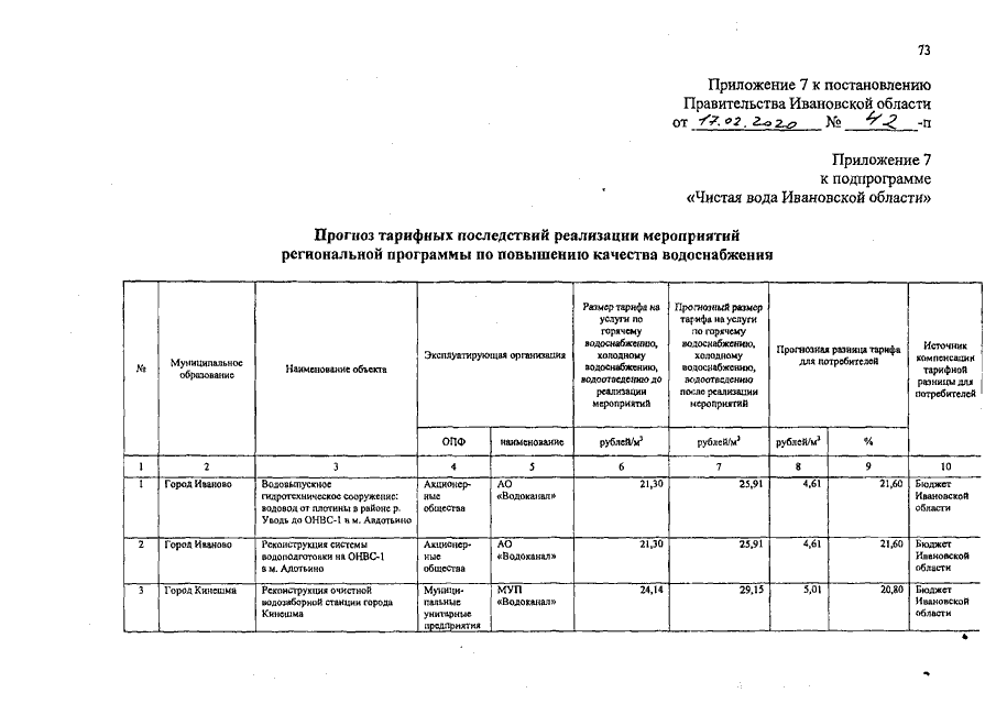 Постановление Правительства Ивановской области от 17.02.2020 N 42-п "О внесении изменений в постановление Правительства Ивановской области от 06.12.2017 N 458-п "Об утверждении государственной программы Ивановской области "Обеспечение услугами жилищно-коммунального хозяйства населения Ивановской области" (вместе с "Порядком предоставления и распределения субсидий бюджетам муниципальных образований Ивановской области на строительство и реконструкцию (модернизацию) объектов питьевого водоснабжения", "Порядком предоставления и распределения субсидий бюджетам муниципальных образований Ивановской области на разработку проектной и рабочей документации на строительство и реконструкцию (модернизацию) объектов питьевого водоснабжения", "Прогнозом тарифных последствий реализации мероприятий региональной программы по повышению качества водоснабжения")